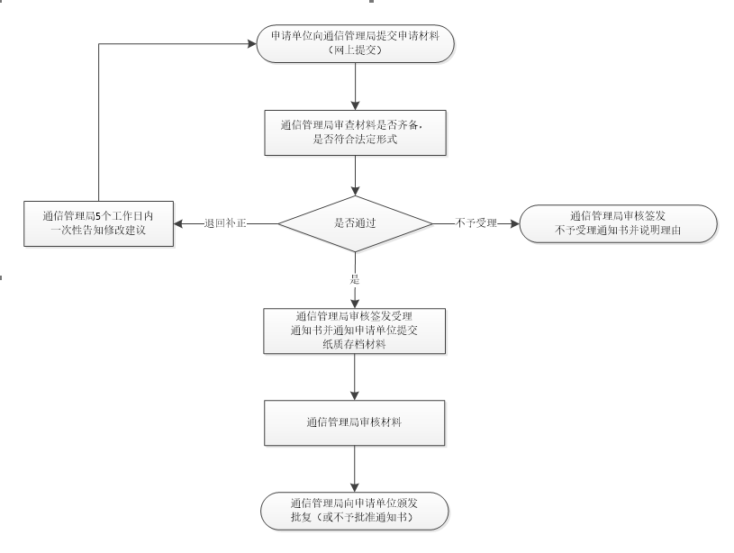 办理材料齐全、符合法定形式的,省、自治区、直辖市通信管理局应当向申请单位出具受理申请通知书;办理材料不齐全或者不符合法定形式的,通信管理局应当当场或在5个工作日内一次性告知申请单位需要补正的全部内容;不予受理的,通信管理局应当向申请单位出具不予受理通知书,并说明理由。