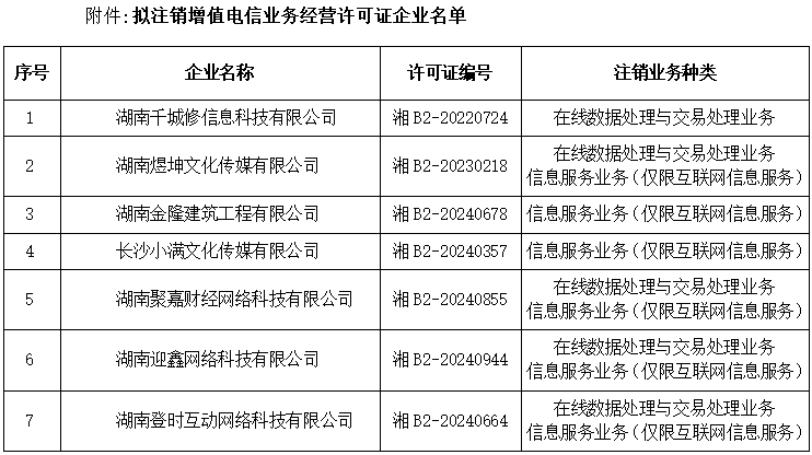 湖南千城修信息科技有限公司、湖南煜坤文化传媒有限公司、湖南金隆建筑工程有限公司、长沙小满文化传媒有限公司、湖南聚嘉财经网络科技有限公司、湖南迎鑫网络科技有限公司、湖南登时互动网络科技有限公司主动申请注销省内增值电信业务经营许可证。为维护电信用户合法权益,妥善解决用户善后问题,依据《中华人民共和国行政许可法》第七十条、《电信业务经营许可管理办法》第三十一条规定,现对拟注销省内增值电信业务经营许可证的企业相关信息进行公示,公示期为自公示之日起三十日。