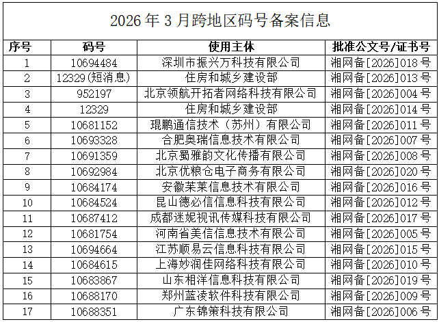 2026年3月湖南省码号审批、备案信息