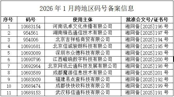 经湖南省通信管理局审核,河南讯卓文化传播有限公司等11家单位通过跨地区码号备案申请,特此公布。