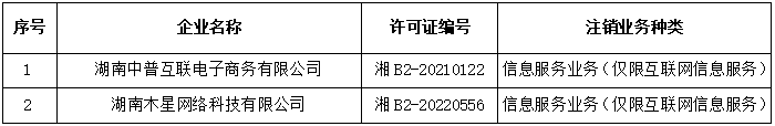 湖南中普互联电子商务有限公司、湖南木星网络科技有限公司主动申请注销省内增值电信业务经营许可证。为维护电信用户合法权益,妥善解决用户善后问题,依据《中华人民共和国行政许可法》第七十条、《电信业务经营许可管理办法》第三十一条规定,现对拟注销省内增值电信业务经营许可证的企业相关信息进行公示,公示期为自公示之日起三十日。