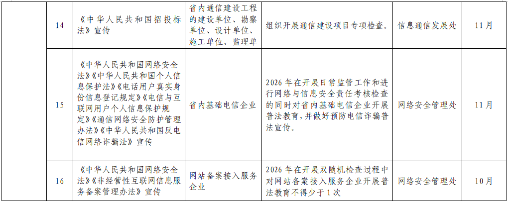 (一)强化内部学法,夯实法治工作基础。健全普法领导工作机构,严格落实“谁执法谁普法”普法责任制,由政策法规处梳理年度普法任务措施清单与党内法规学习目录,明确普法内容、对象、措施、时限、责任部门及责任人,保障普法工作有序推进。完善党组理论学习中心组学法制度,推动领导干部带头尊法学法守法用法,确保局党组集体学法、全局干部职工法治培训每年均不少于2次。规范党内法规学习,强化行政执法培训,不定期推送法律条文、典型案例等学习内容,组织开展学法考法活动,实现法治教育制度化、常态化。(二)深化行业普法,融入监管履职全过程。坚持执法与普法有机结合,将法治宣传贯穿行政执法全流程,采取说服教育、劝导示范、指导约谈等方式,精准宣传网络安全、反电信网络诈骗、电信管理等相关法律法规,引导行政相对人依法经营。完善以案释法制度,面向社会公示执法典型案例每年不少于4件,把执法办案转化为普法实践。依托行政纠纷化解开展普法,组织电信企业旁听行政诉讼案件庭审;在涉法涉诉信访处理中,引导当事人依法表达诉求、理性维权,以法治方式化解矛盾纠纷。(三)抓实节点普法,拓宽社会宣传覆盖面。紧扣“3·15”消费者权益日、“4·15”全民国家安全教育日、“5·17”世界电信日、安全生产月、“12·4”国家宪法日等重要时间节点,集中开展面向社会的法治宣传活动。通过法律咨询、发放宣传资料、张贴标语、悬挂横幅等多种形式,推动法治宣传教育进社区、进学校、进企业,全面提升社会公众的法治意识。